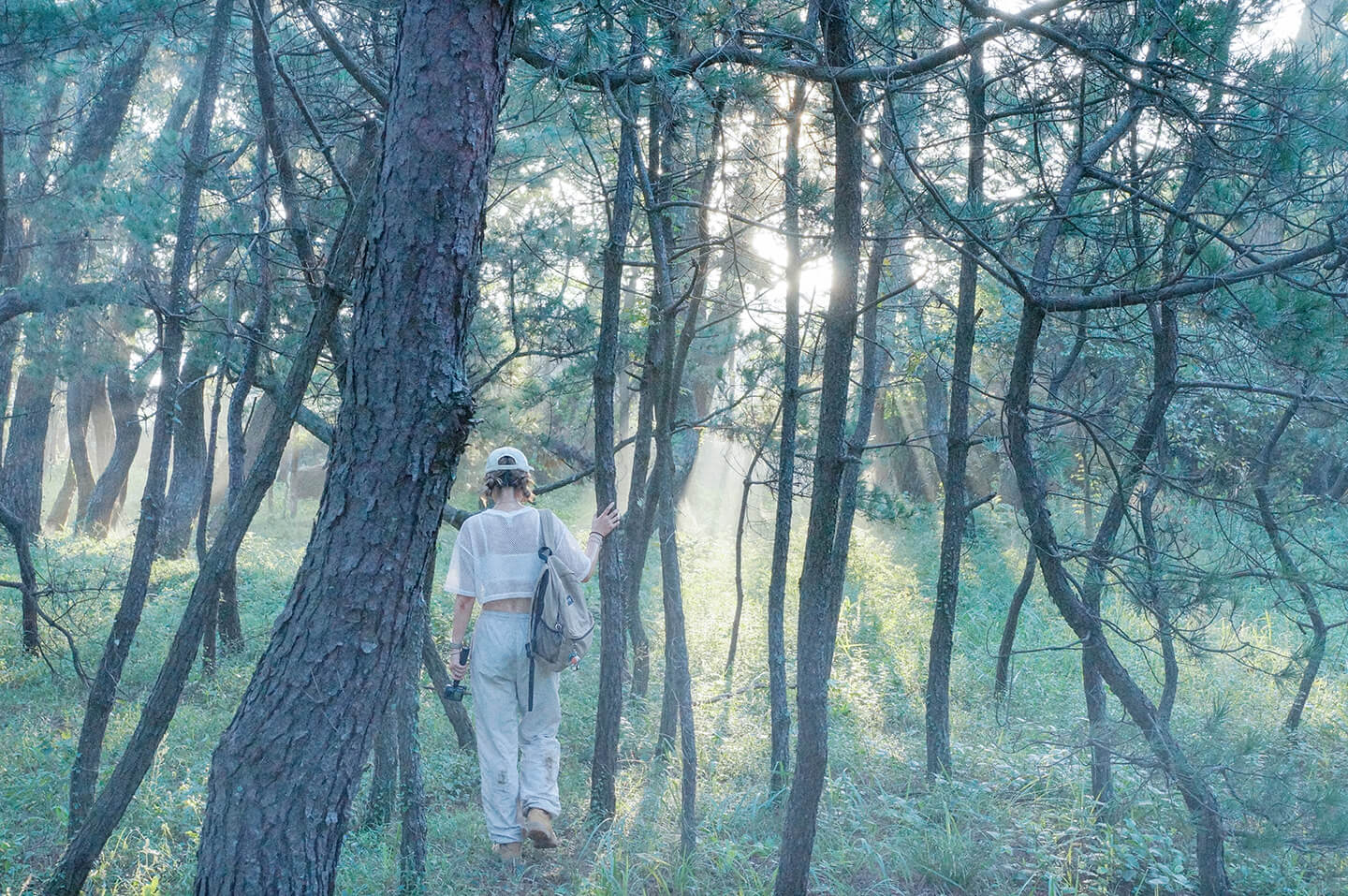 「人を魅するの力」とは、一目見ただけで抵抗しがたく心を引きつけられる、風景の持つ魔力のような魅力を指しています。 「さながら夢幻の境(むげんのさかい)のごときもの」とは、眼前の景色があまりに美しすぎて、現実の世界とは思えず、まるで夢や幻の世界に迷い込んだかのようだという意味です。 唐津湾の海岸線に続く広大な松林の美しさを、現実を超越した幻想的な体験として賛美した、詩人・蒲原有明らしい格調高い表現です。